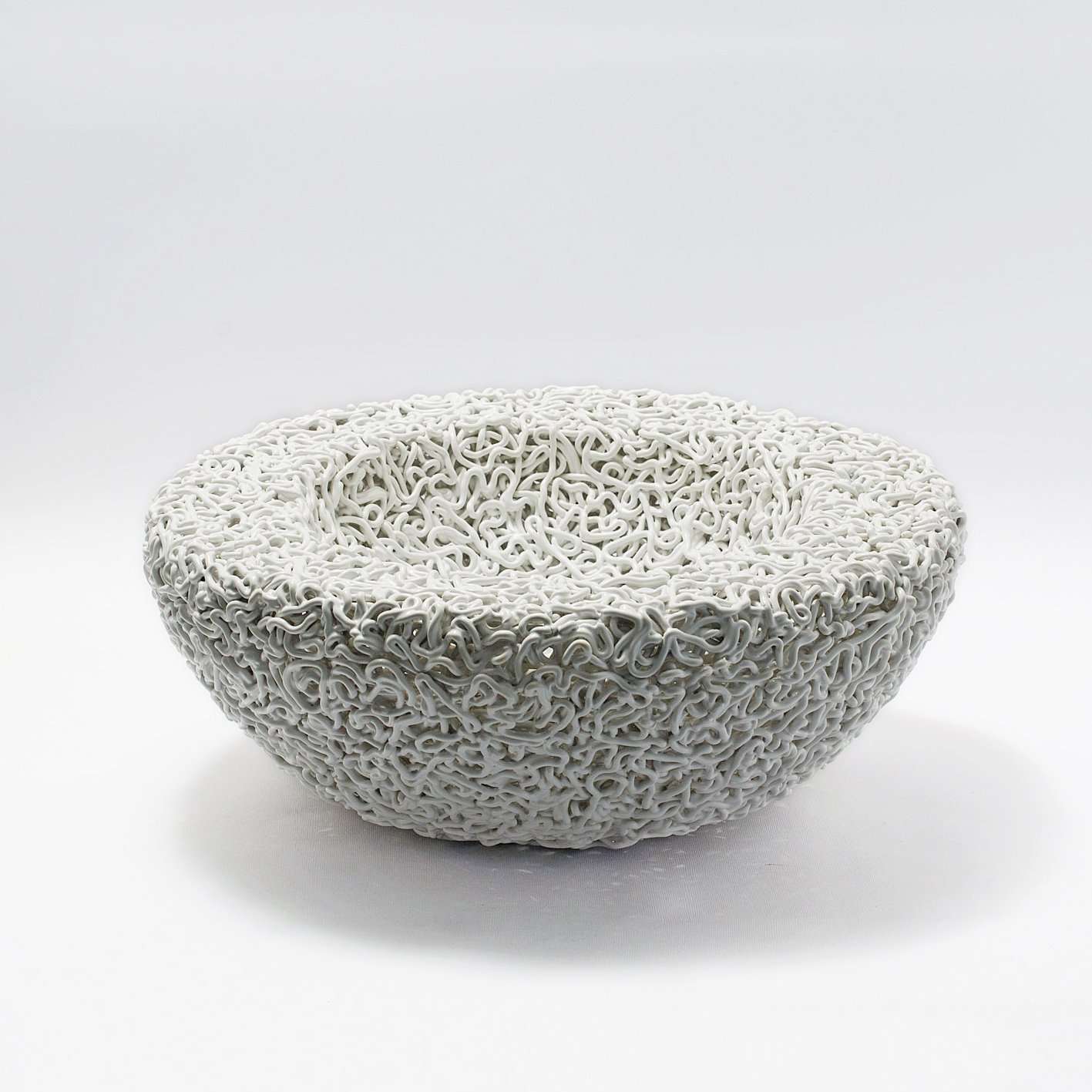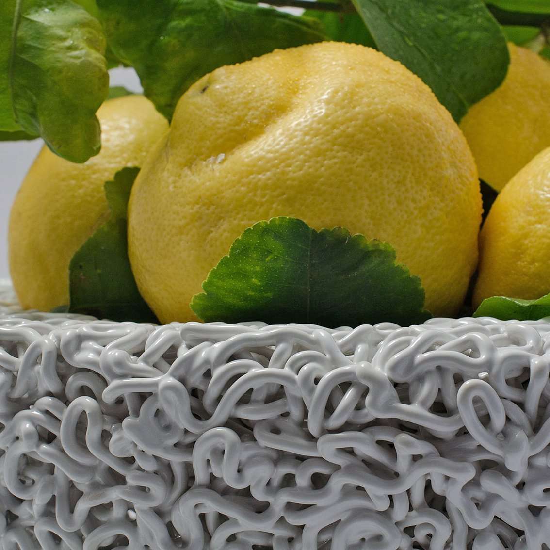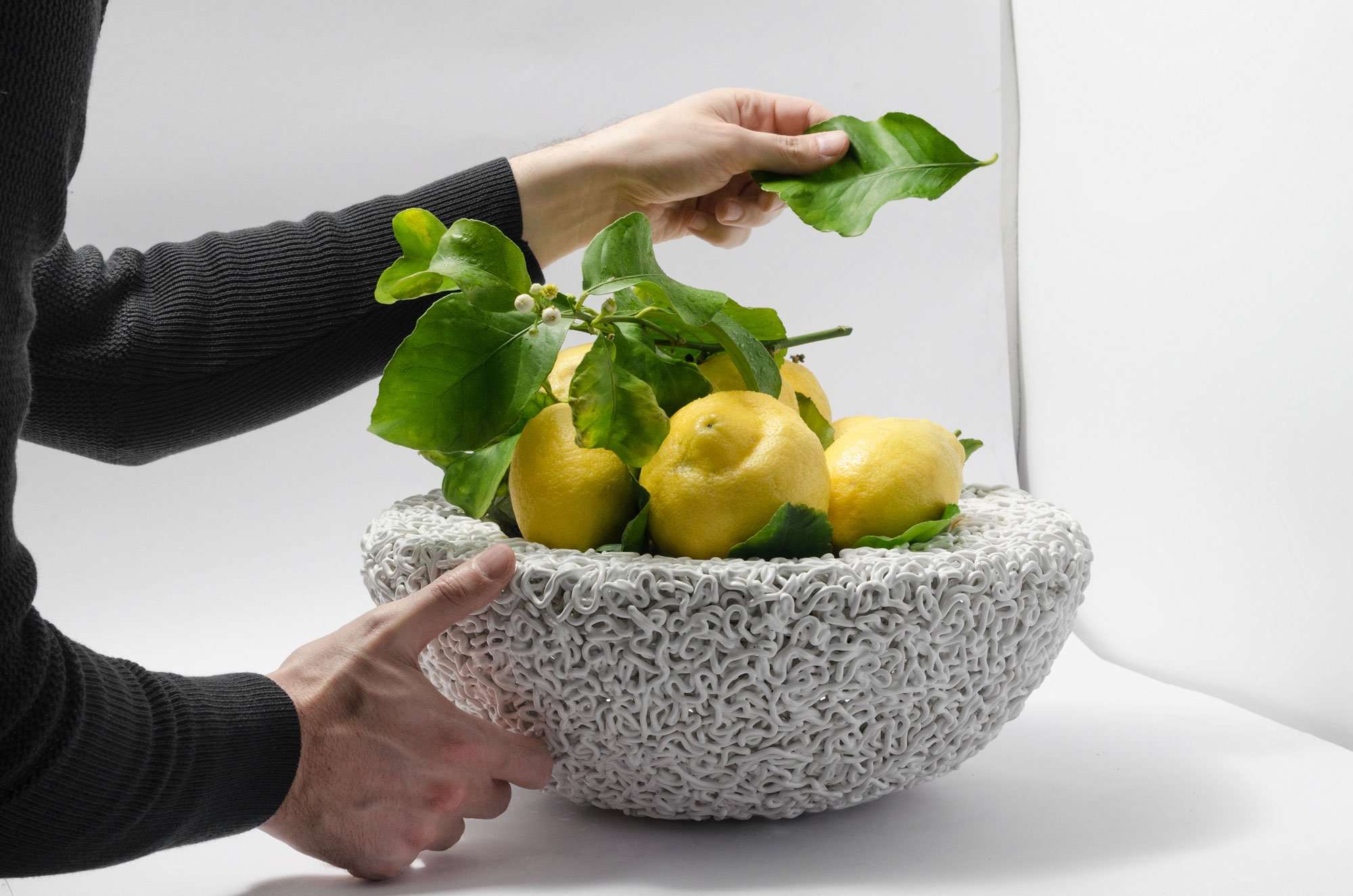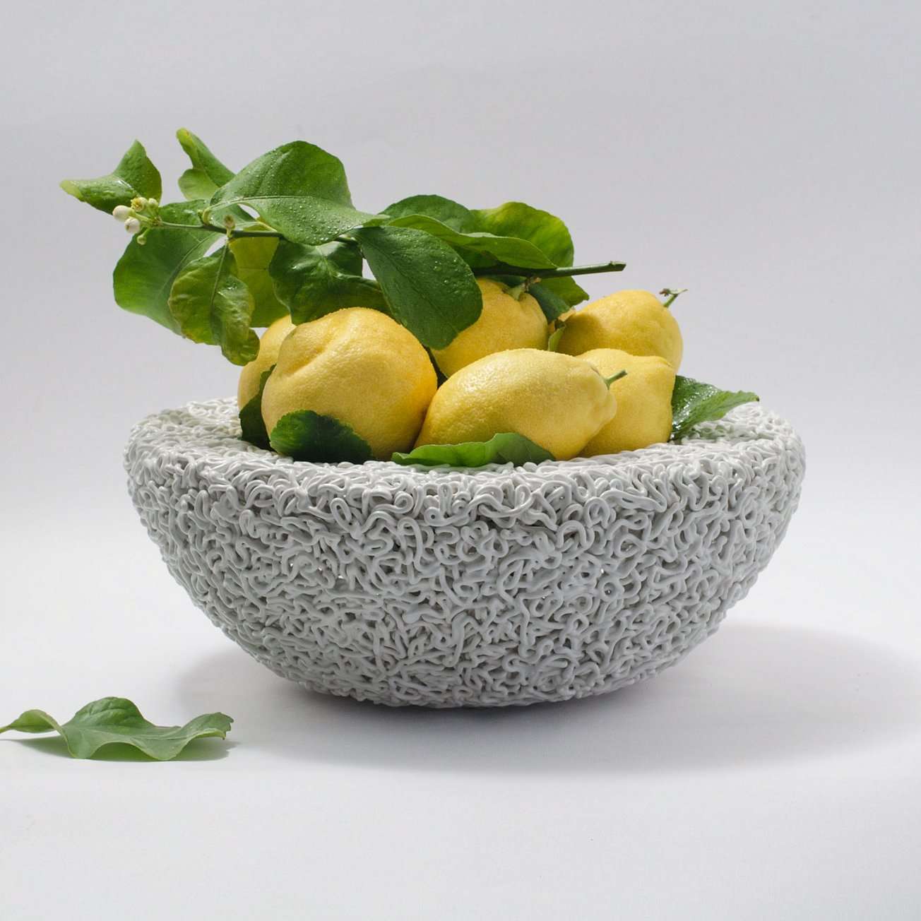 Caos is a polished ceramic centrepiece, a bowl made with an old technique called “braided coil”. The creation of each piece is first and foremost a technical challenge, as the ceramic “wire” moves without allowing us to find repetition. The complexity of the piece is not chaotic, but a cosmic balance.
