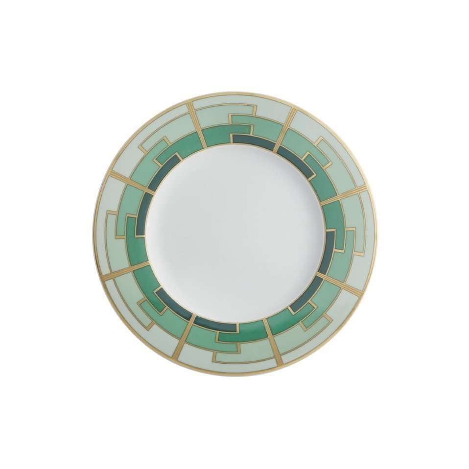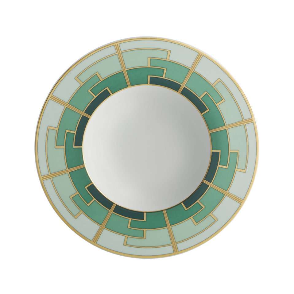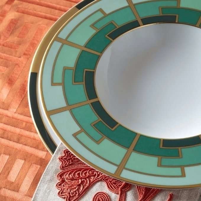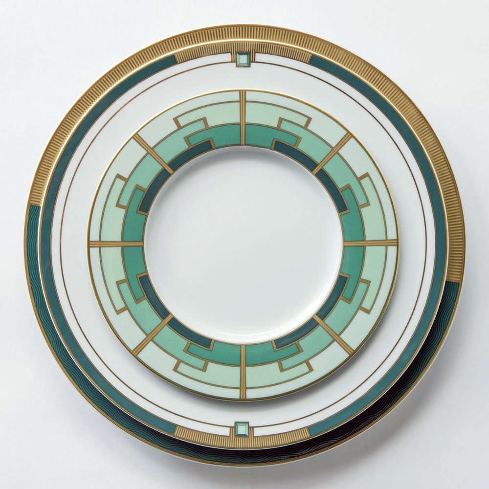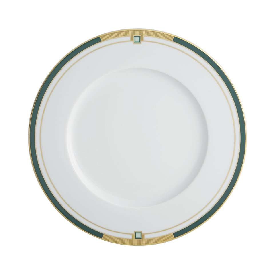 Hand-crafted and hand-painted porcelain 24 piece dinner set from the Emerald Collection of the Portuguese manufacturer Vista Alegre. These Art-Deco inspired pieces are richly decorated with matte gold and dark green making them a celebration of modern porcelain. Not suitable for microwaves. For dishwashing, we advise short cycles at low temperatures. Avoid frequent use in dishwashing.
