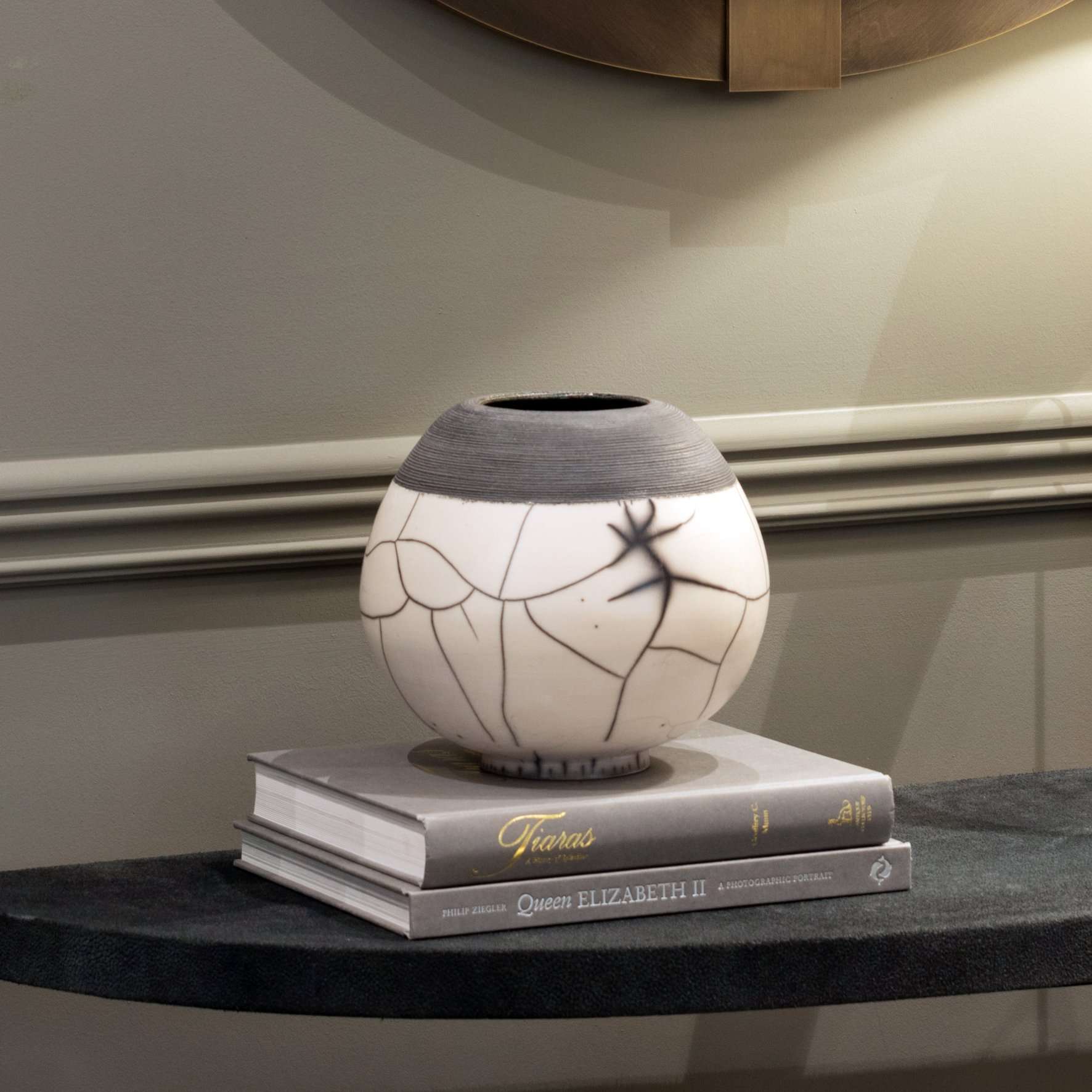 Large Naked Raku ceramic volcano vase with smoked top and Bottle Green glaze finish inside by Italian product designer Denis Di Luca. This piece is made using special Raku clay, which is applied on top of each individual piece prior to firing in order to generate the thermal shock. The special tones are created as a result of the raku firing process, while the unique patterns are created during the cooling process. Each vessel is individually fired and hand-finished using Naked Raku technique. Please note the product images are only for general reference, as each glaze will be different every time due to the unique nature of Raku. Bespoke designs are available on request.